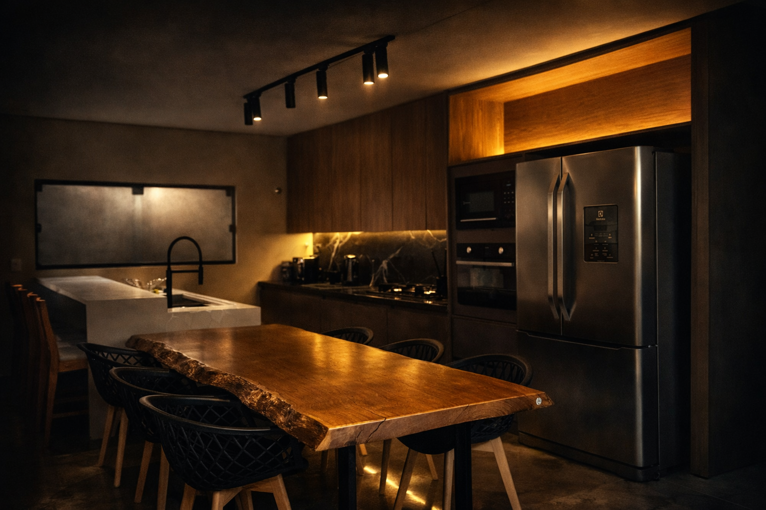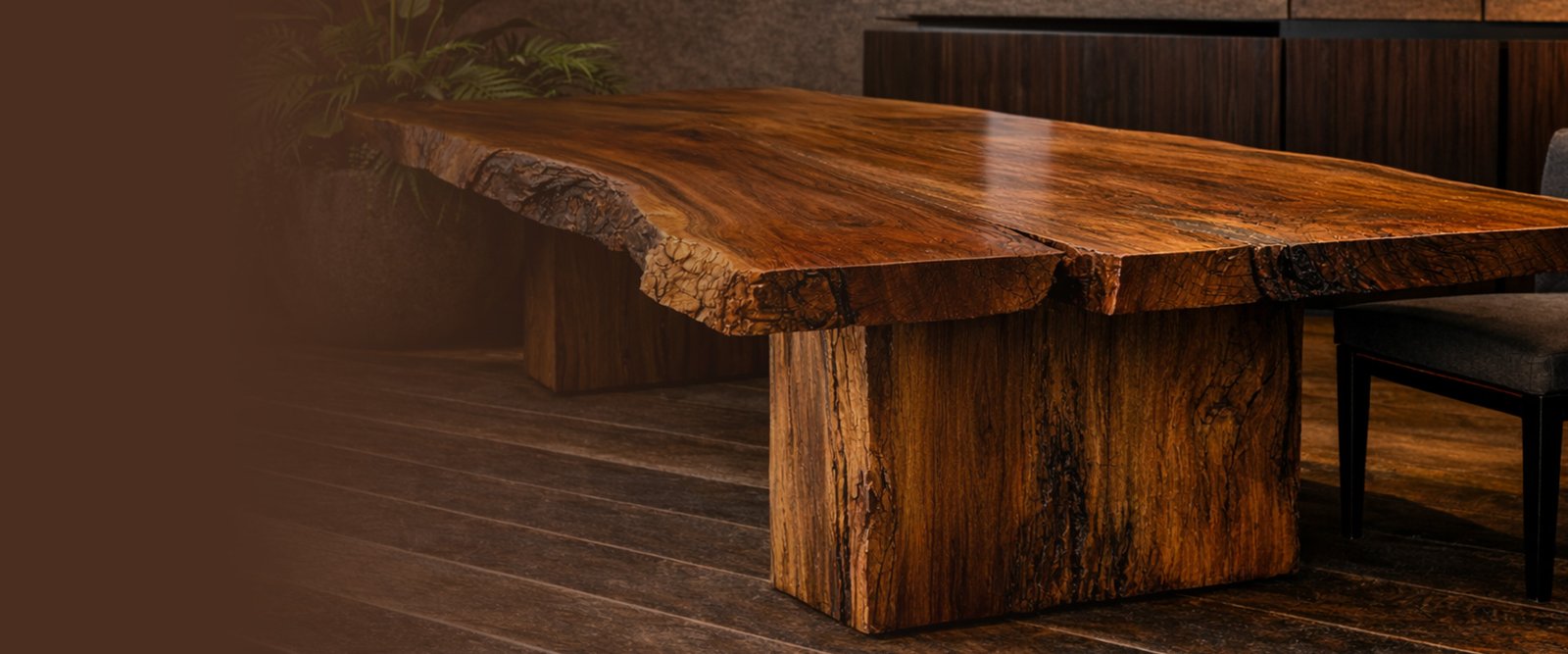 Cada peça nasce da matéria viva e se transforma em mesa, bancada ou escultura pensada para arquitetura e para os encontros que acontecem ao redor dela.